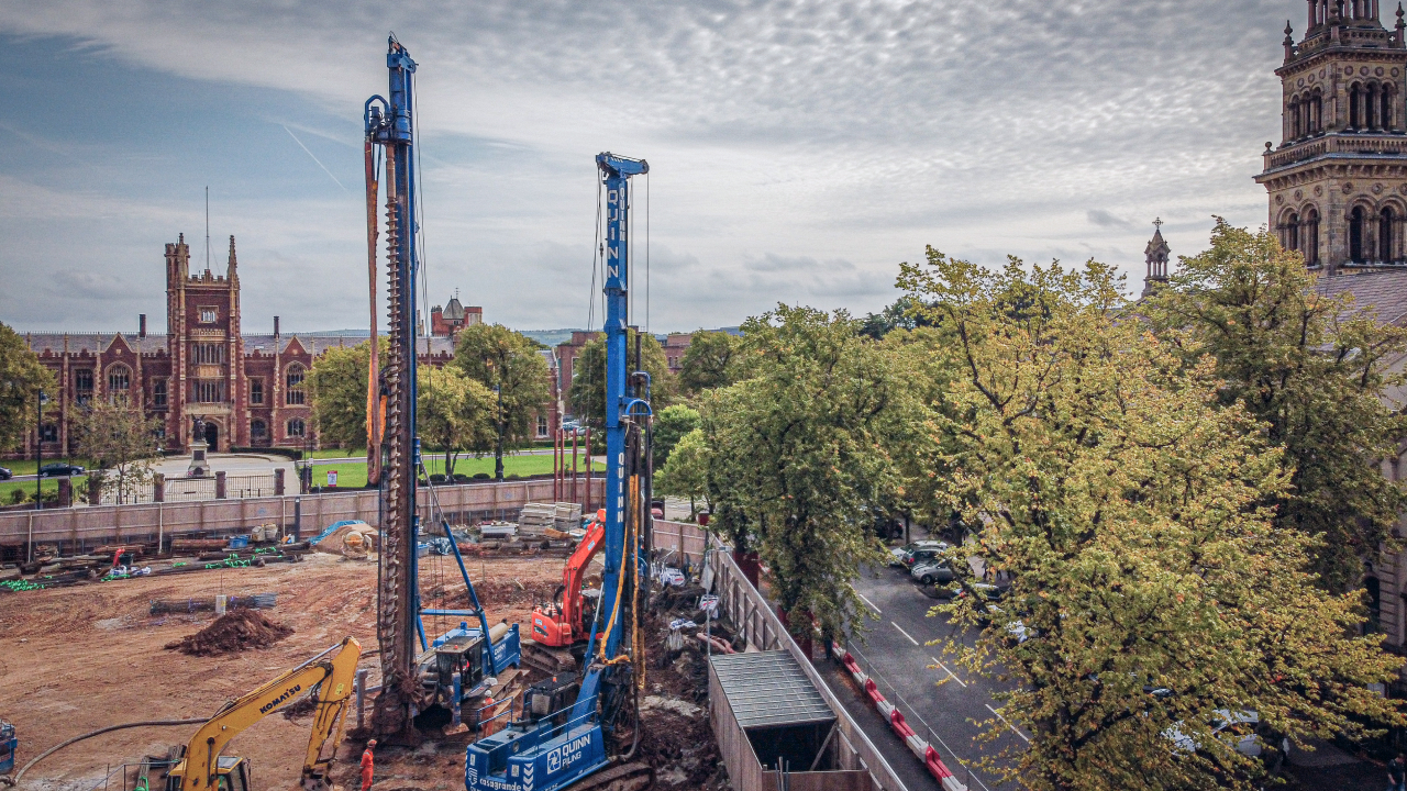 Quinn Piling were initially contacted in January 2020 to assist with the piling solution for the proposed Student’s Union. After providing ‘value-engineering’ to the scheme, Quinn Piling commenced installation in July. The new building replaced the former Student’s Union in the same location, at the junction of University Road and Elmwood Avenue, sitting at the heart of the campus. The site consists of a gross internal area of approximately 10,300m2