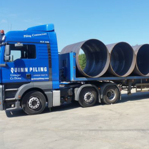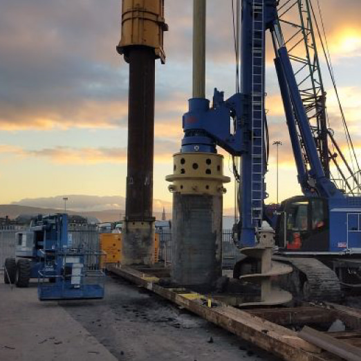 The works comprised the installation and ‘mucking-out’ of 110 no. large diameter temporary pile casings (1.8m diameter) to a depth of 27m to get through the difficult Dublin boulder clay layer and enable the JV to follow closely behind to pitch and drive the 1.4m diameter permanent steel tubular piles a further 9m deeper.-Our engineering department manufactured a special pile top ‘pile-gate’ to ensure the permanent tubular piles were driven vertically and installed in the correct position with correct rotation to a lower level within the 1.8m temporary casing to ensure the sheet piles, which would be installed later by Quinn Piling, would fit perfectly between the tubes without the risk of de-clutching.
