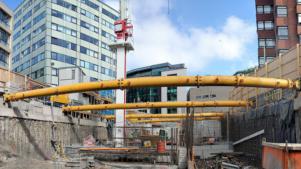 Secant piled walls are constructed by overlapping bored piles to form a continuous wall, often alternating unreinforced “female” piles with reinforced “male” piles. This produces both structural capacity and a watertight barrier. They are used where excavation support must also prevent groundwater ingress, such as in basements, shafts and deep excavations in variable ground.