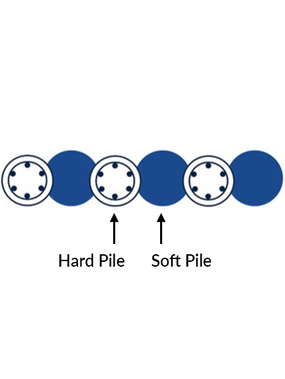 Primary (or Female) piles are installed first. Once the Primary piles have gained sufficient strength, Secondary (Male) piles are constructed in between them and cutting into the Primary piles. The installation sequence is determined by ground conditions but is normally on a ‘hit and miss’ 2 or 3 piles basis. After a sufficient initial curing period (2-4 days) and once each alternate pile is formed, the reinforced ‘male’ piles are installed. Pile overlap (cut) typically ranges from 75mm to 100mm. Primary piles are usually un-reinforced. Secondary piles can be rock-socketed for additional loading requirements and are usually reinforced with full-length steel-reinforcement cages or, less commonly, with steel sections. The secant between hard and soft piles ensures that water seepage is minimised and wash-out of ‘fines’ is prevented. The inter-locking secant wall is not watertight; however water flow is considerably reduced.