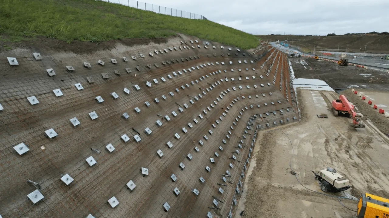 Soil nails are passive reinforcement bars inserted into slopes or excavations, usually grouted in place, to stabilise the soil mass. They rely on ground movement to mobilise their strength. This method is often used for slope stabilisation and temporary works where a discreet and flexible solution is required.